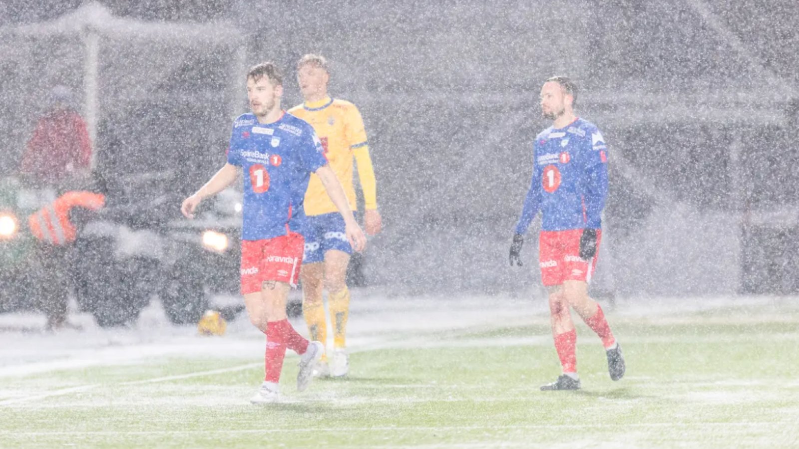 Det ble en kamp preget av mye vær og utfordrende forhold på matta, allerede etter 17 minutter stoppet dommeren kampen for å få ryddet banen for snø. Et lite opphold på 10 minutter - og så var det klart for kamp igjen.